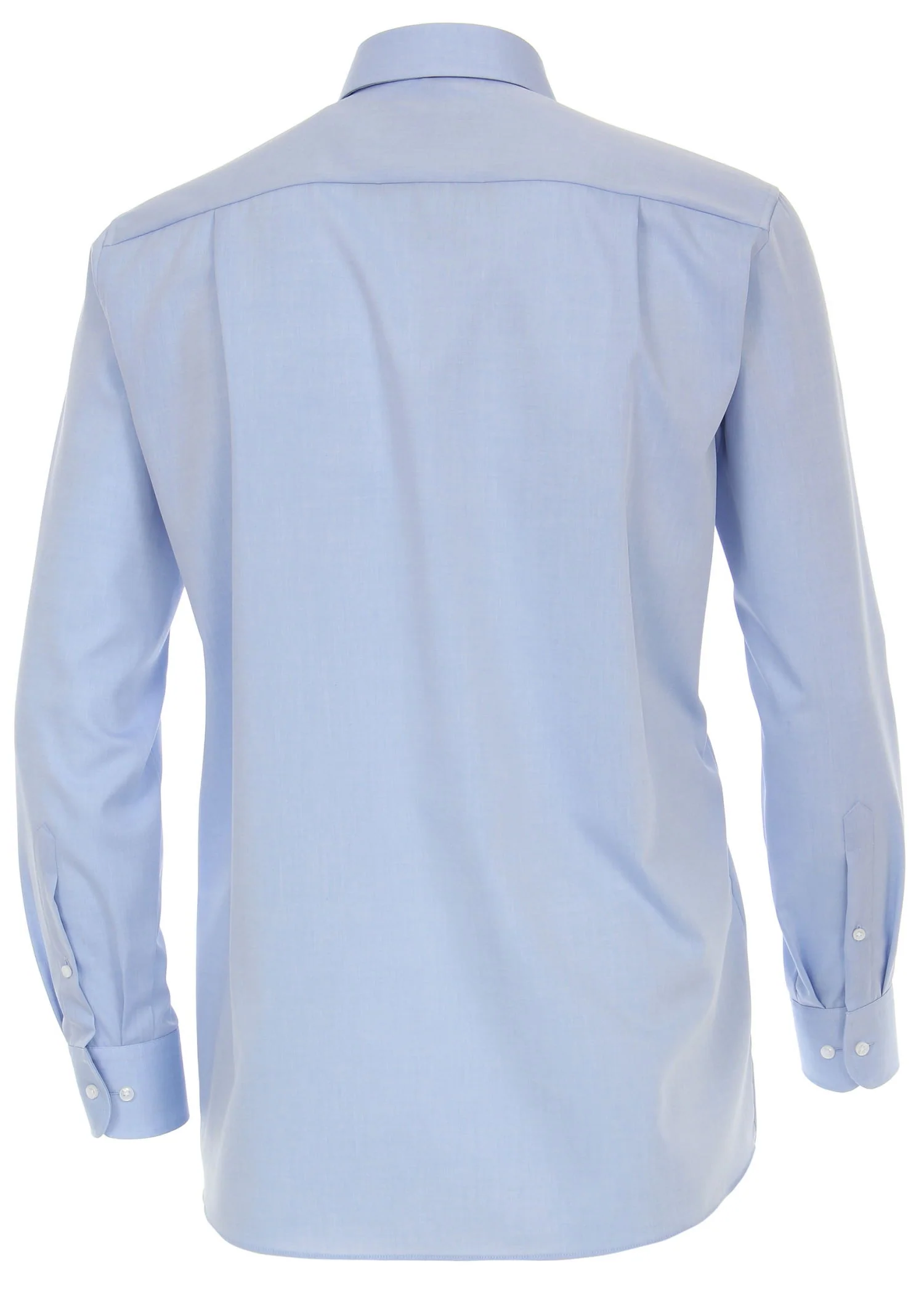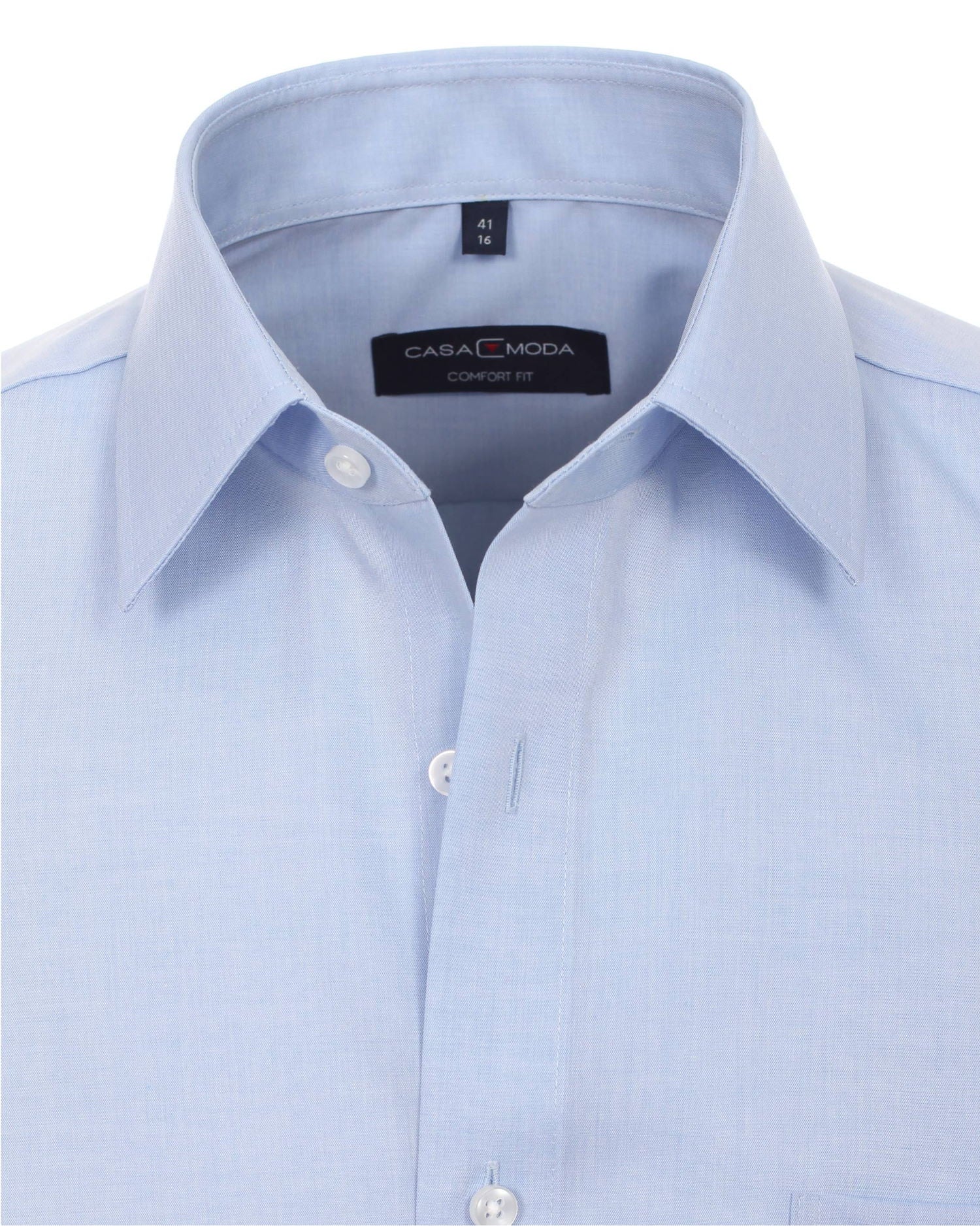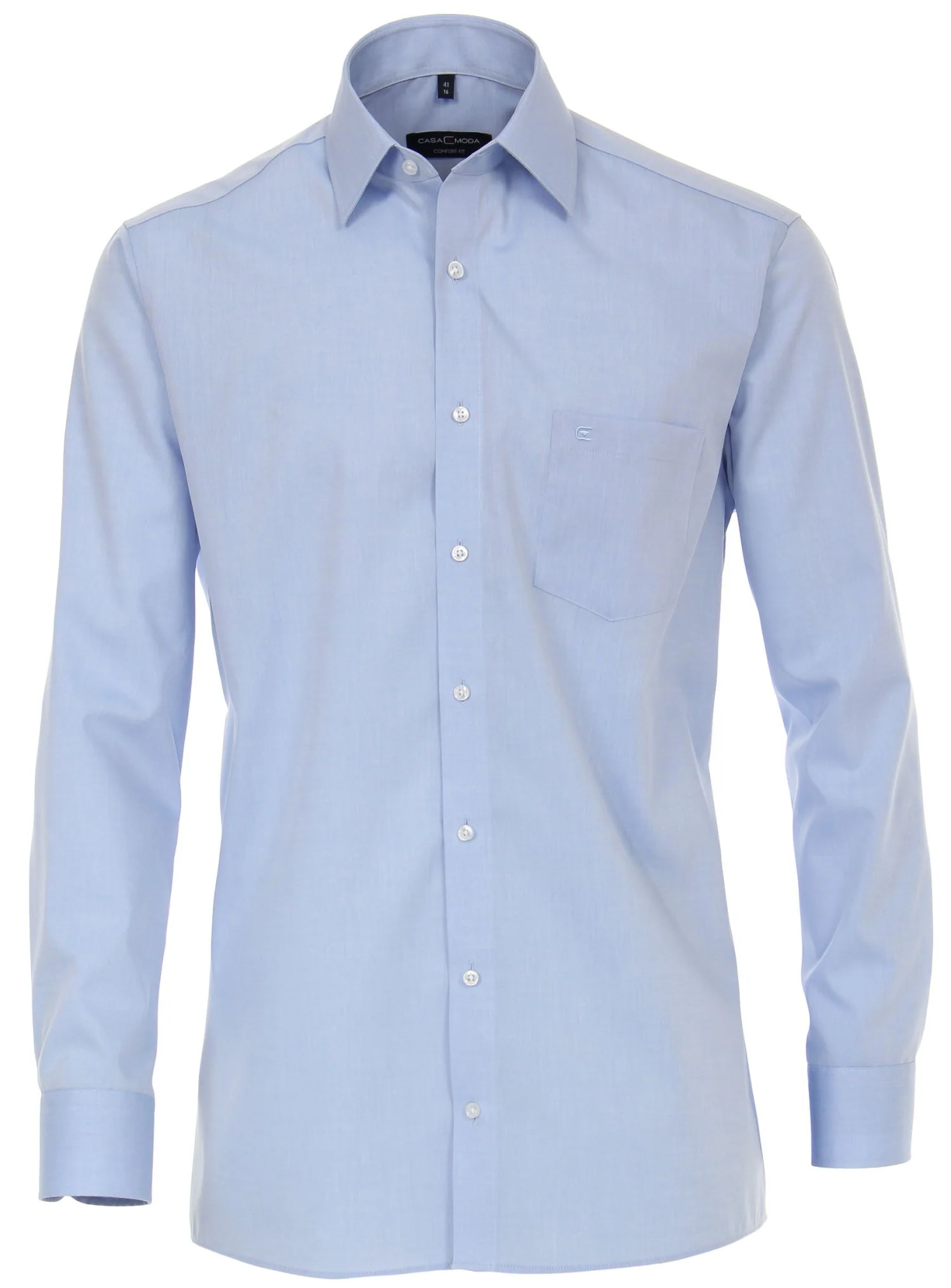 Blauw overhemd met extra lange mouwen van Casa Moda. Dit overhemd is met name geschikt voor business gelegenheden, maar eigenlijk geschikt voor iedere gelegenheid. Het overhemd is voorzien van een borstzak. De lichtblauwe kleur is goed te combineren met andere kleuren en kledingstukken. Het hemd is van 100% katoen en van een poplin weving. Overhemden van een poplin stof of platte binding hebben een eenvoudig weefpatroon, maar desondanks sterk en fijn. De Kent boord is vergelijkbaar met de traditionele straight point boord. Het overhemd heeft een comfort fit pasvorm, dat wil zeggen dat het niet getailleerd is en zelfs iets ruimer van vorm is. Bovendien is het overhemd eenvoudig te strijken (easy iron).
