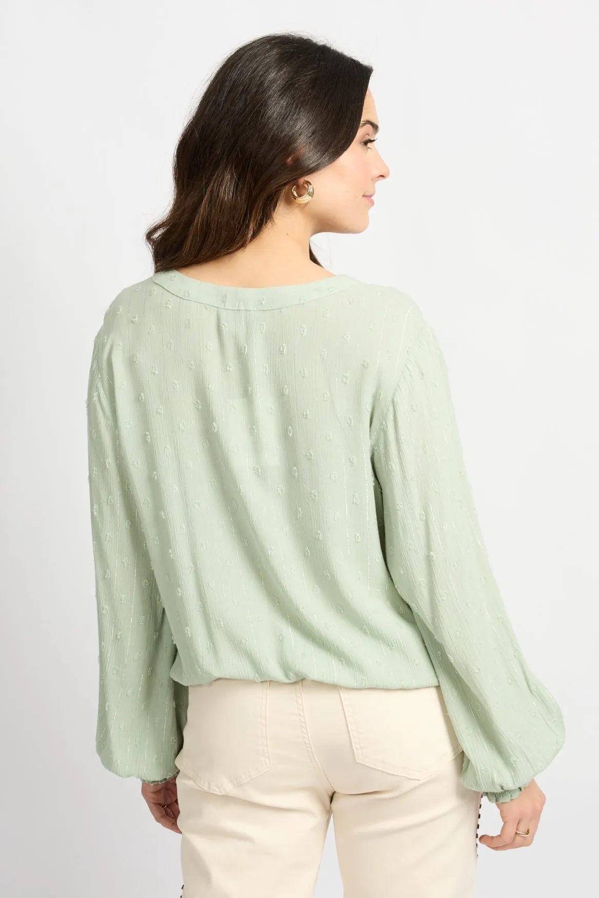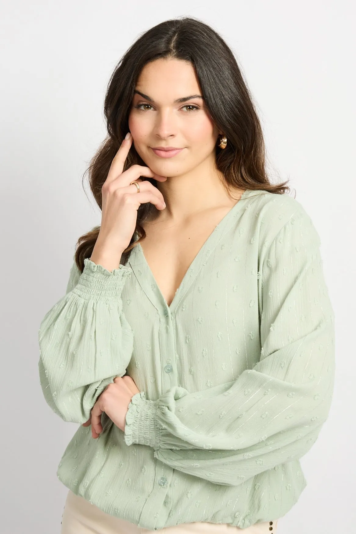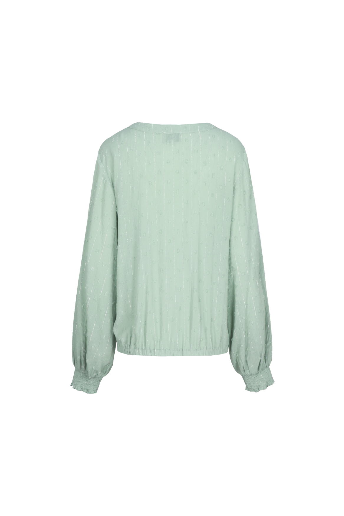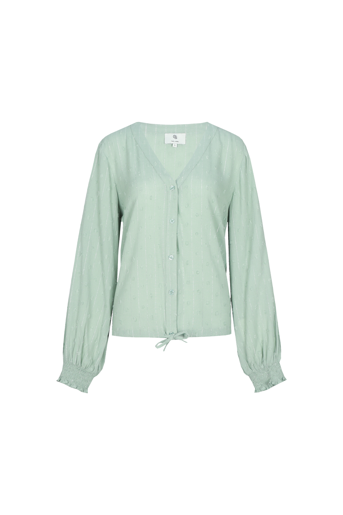 De Lonneke blouse is een elegante blouse met een verfijnde en vrouwelijke uitstraling. Het ontwerp heeft een stijlvolle V-hals en een praktische knoopsluiting aan de voorzijde. De lange mouwen zijn licht gedrapeerd en hebben subtiel volume, wat zorgt voor een chic en modern silhouet. De licht transparante structuur van de stof geeft de blouse een luchtige en luxe uitstraling.