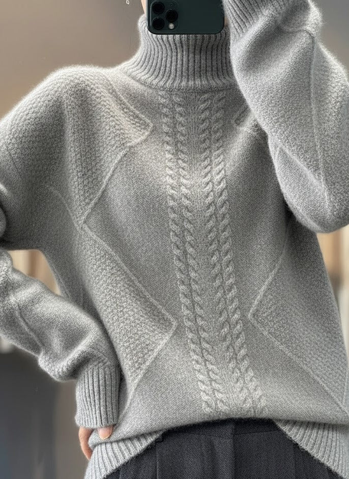 De Dames Gebreide Coltrui met Kabelpatroon en Hoge Hals combineert elegantie en warmte in één tijdloos ontwerp. Het hoogwaardige stof voelt heerlijk zacht aan op de huid en biedt tegelijkertijd ademend en isolerend draagcomfort. Het klassieke kabelpatroon en de hoge hals maken deze trui perfect voor de koudere seizoenen en eenvoudig te combineren met elke outfit.
