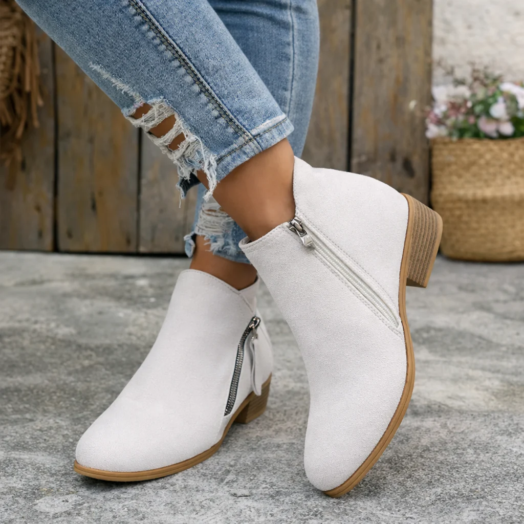 Gemaakt van zacht flock suède met een warme voering en een duurzame rubberen anti slipzool, bieden deze laarzen optimale ondersteuning. De modieuze spitse neus en effen kleur geven een chique uitstraling, terwijl de ritssluiting en elastische inzet zorgen voor een makkelijke instap en perfecte pasvorm.