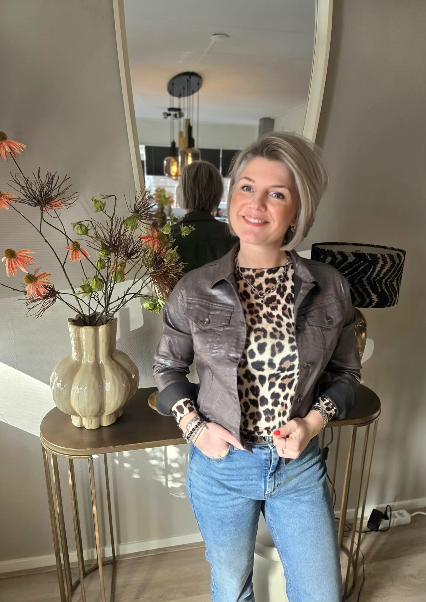 De Jacket Tamar Brown Pearl van Elvira is een modern jasje met subtiele parelglans. De klassieke details en rechte pasvorm maken het een veelzijdig item dat moeiteloos elke outfit afmaakt.