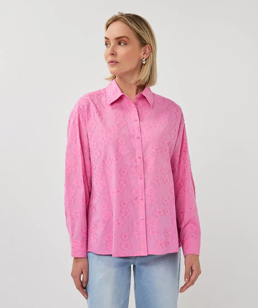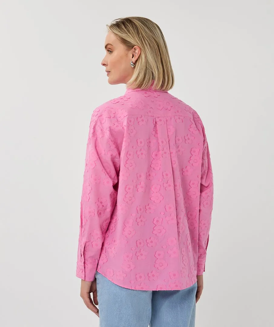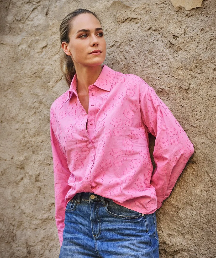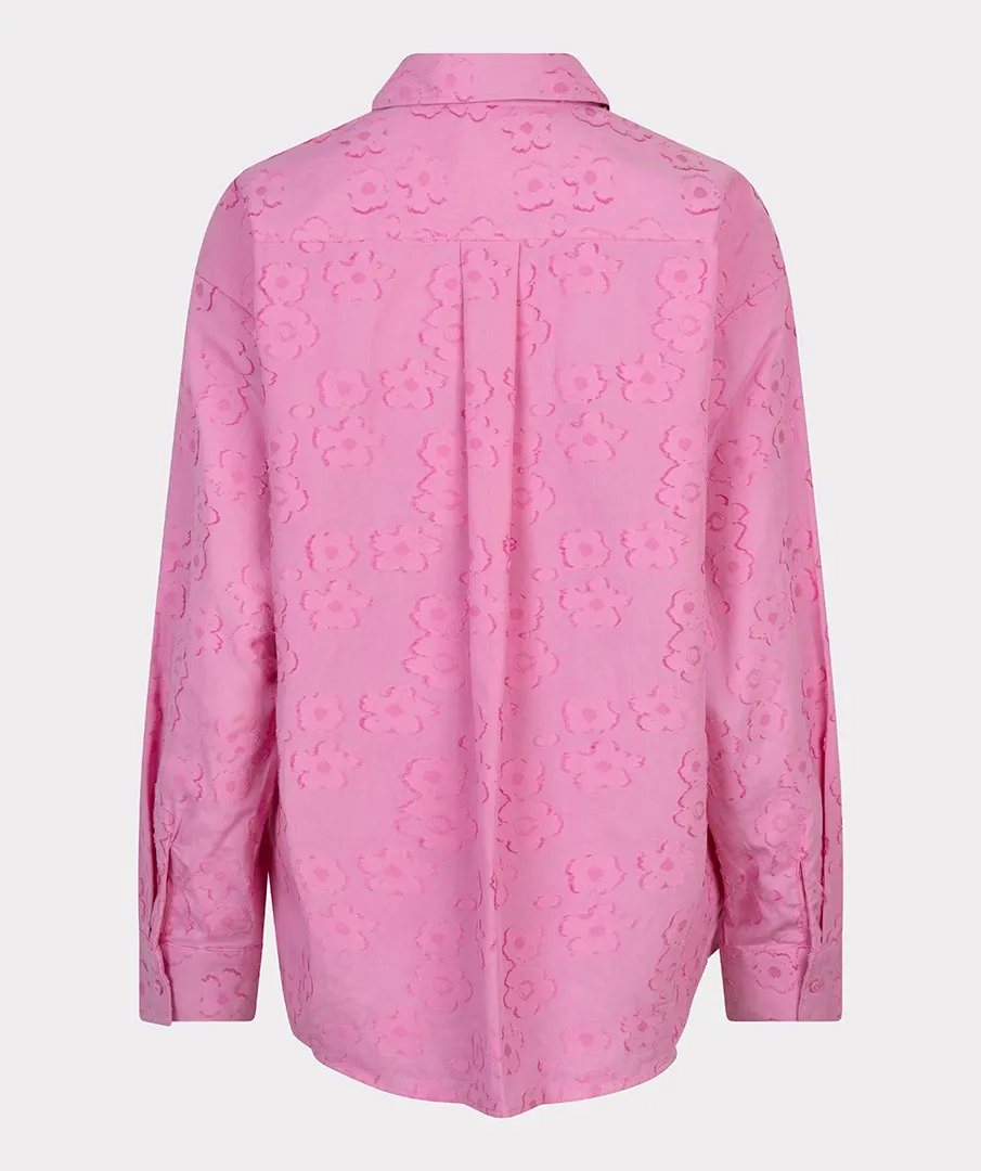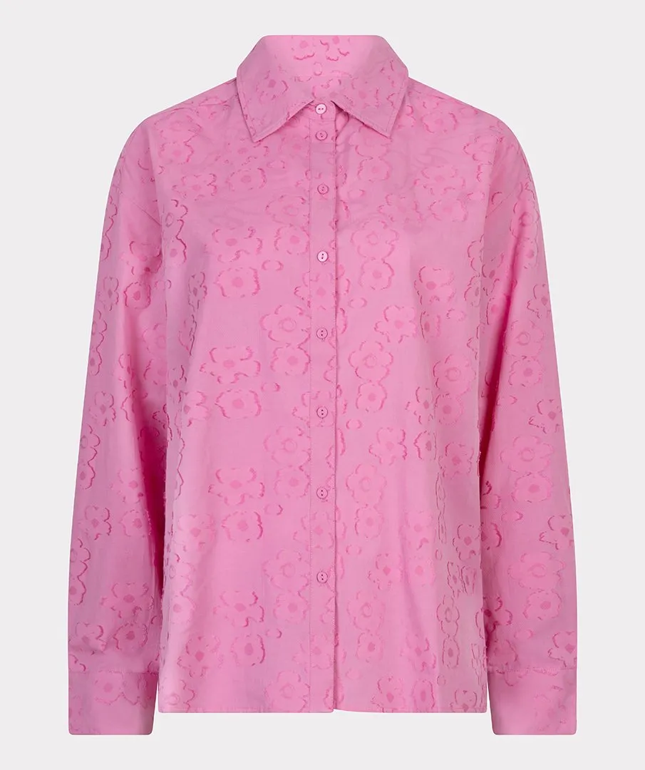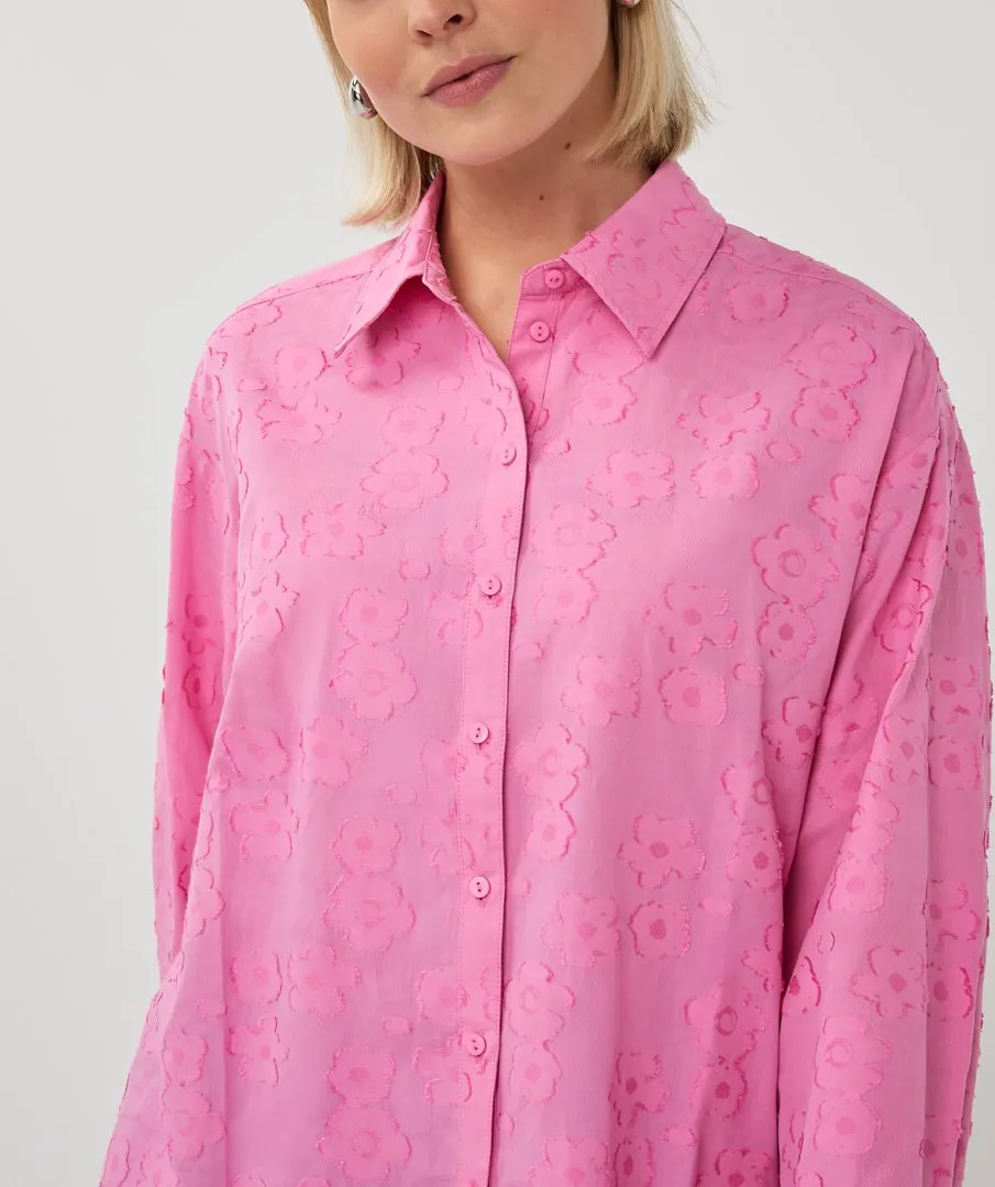 Wijde doorknoopblouse met bloemen jacquard print. De blouse is gemaakt van 65% katoen en 35% viscose.