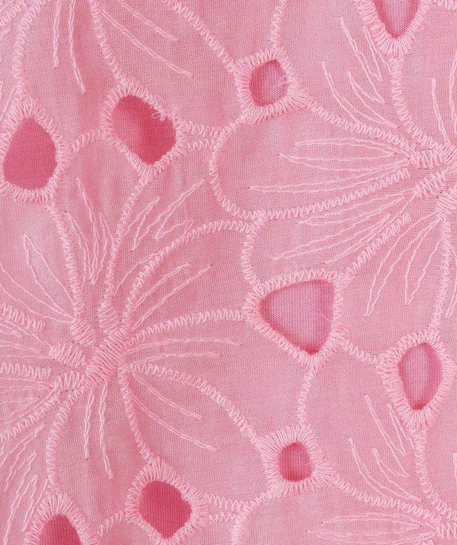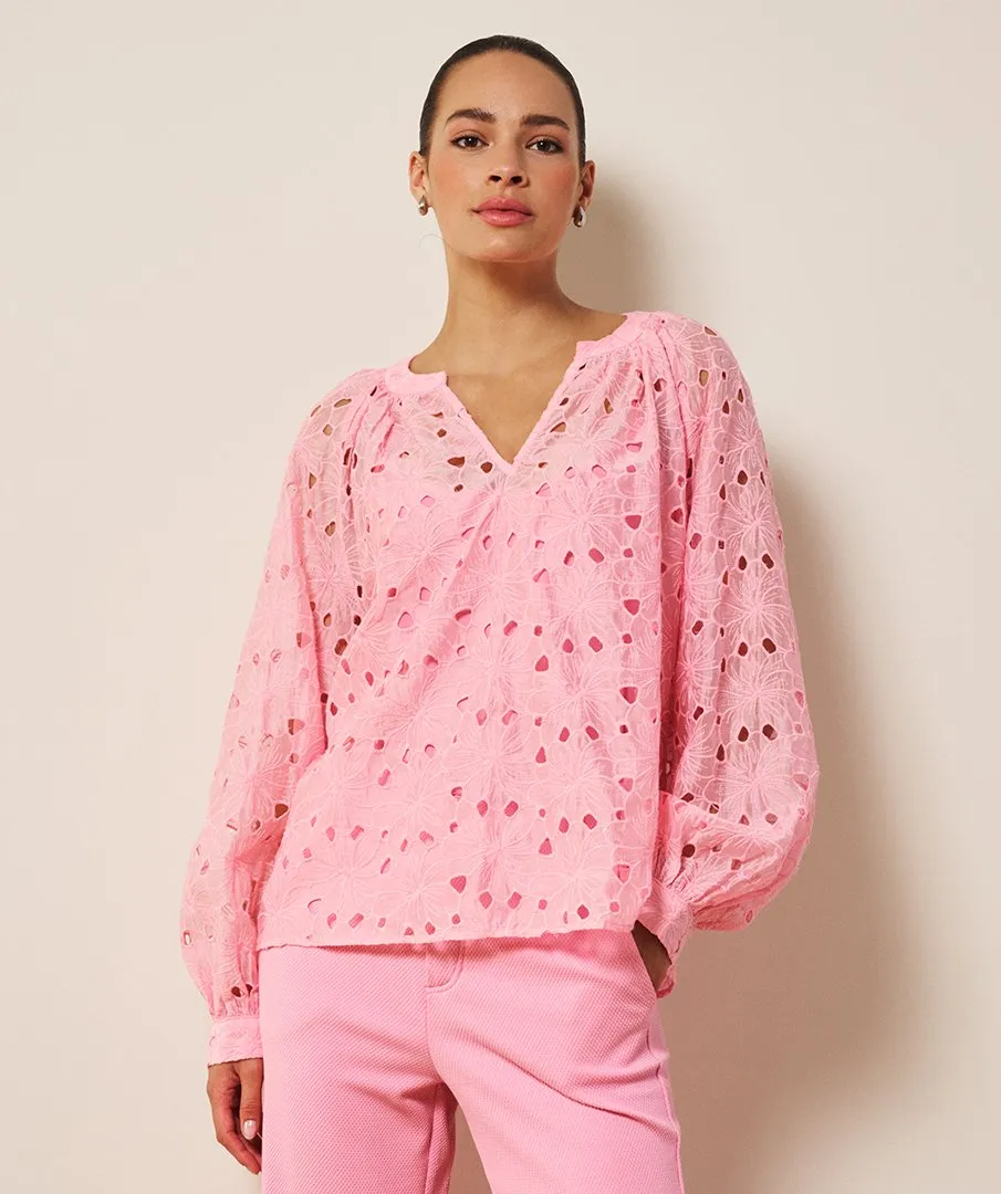 Luchtige bloemen blouse met anglaise broderie. De blouse is doorschijnend en komt inclusief ondertop in bijpassende kleur.