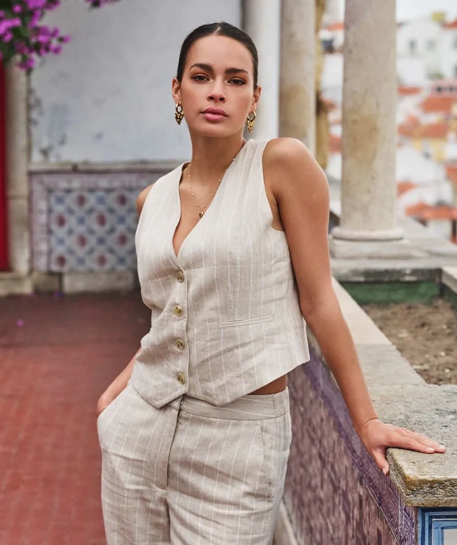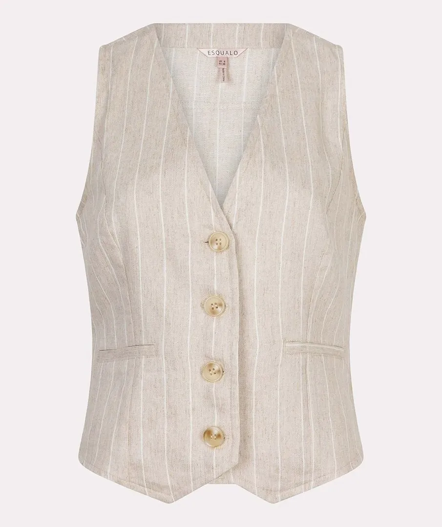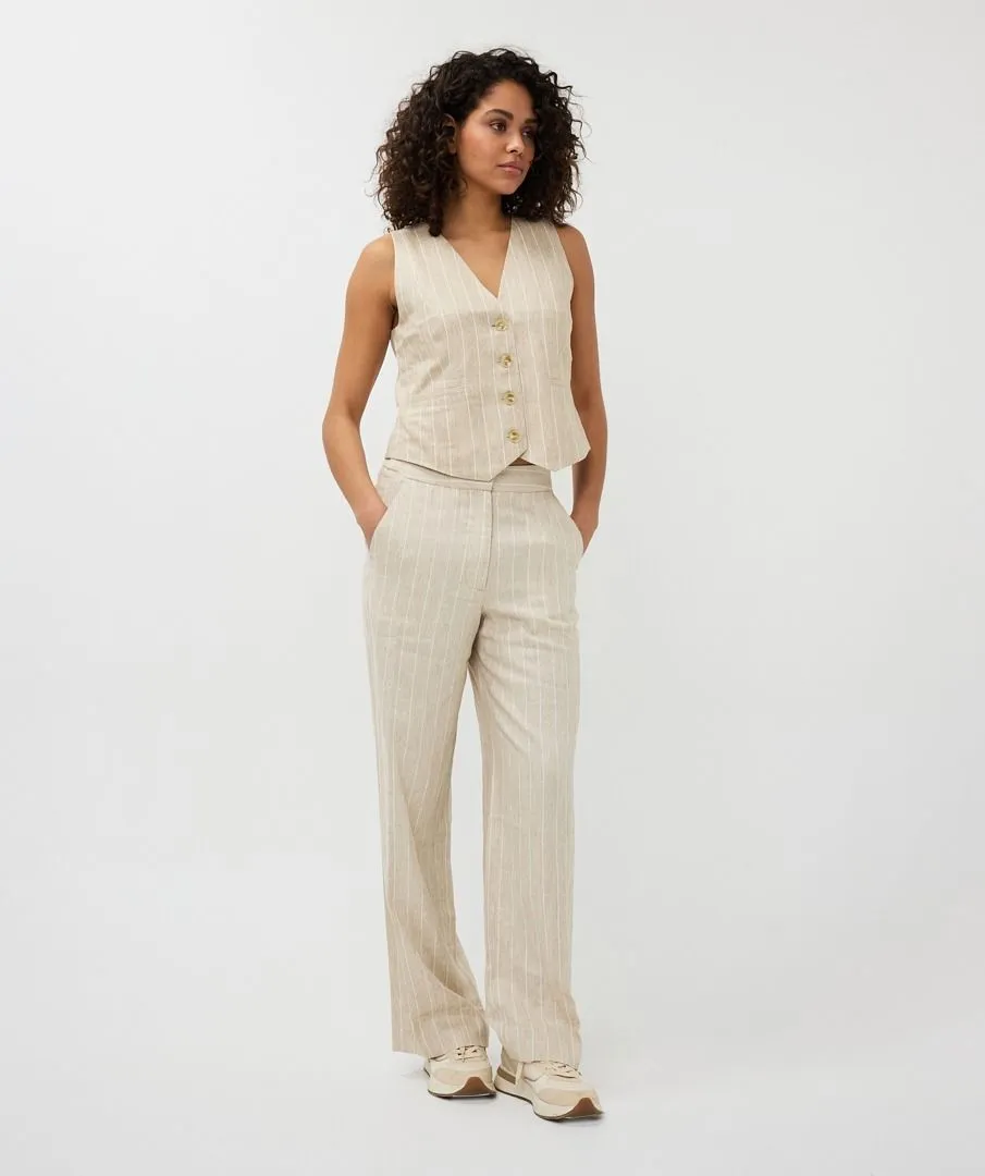 Chic gilet in linnen kwaliteit met ombre knopen en paspelzakjes. Maak de look compleet met de bijpassende blazer en broek. Het gilet bestaat uit 52% linnen en 48% rayon.