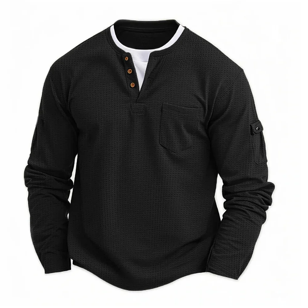 Het Heren Longsleeve Shirt met Henley Hals en Borstzak combineert casual stijl met praktisch design. De Henley hals met knoopsluiting en het subtiele laagjesdetail bij de kraag geven dit shirt een moderne uitstraling. Dankzij de comfortabele pasvorm en het wafelstructuurpatroon is het ideaal voor koelere dagen in het herfstseizoen.