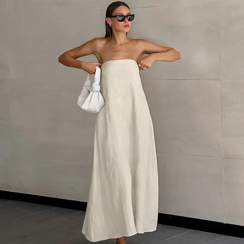 Deze elegante maxi jurk is gemaakt van ademend, lichtgewicht linnen en biedt ultiem comfort tijdens warme dagen. Het strapless model accentueert je schouders en geeft je een verfijnde, vrouwelijke uitstraling. Dankzij de los vallende pasvorm valt de jurk soepel om het lichaam en biedt het volop bewegingsvrijheid – perfect voor city strolls, terrasjes of een strandvakantie.