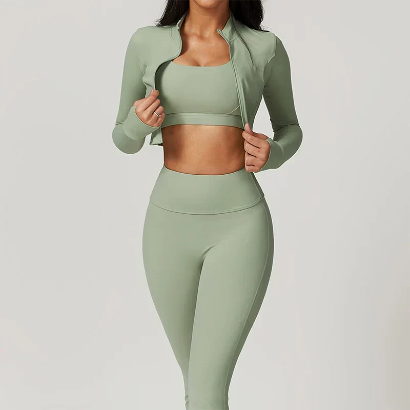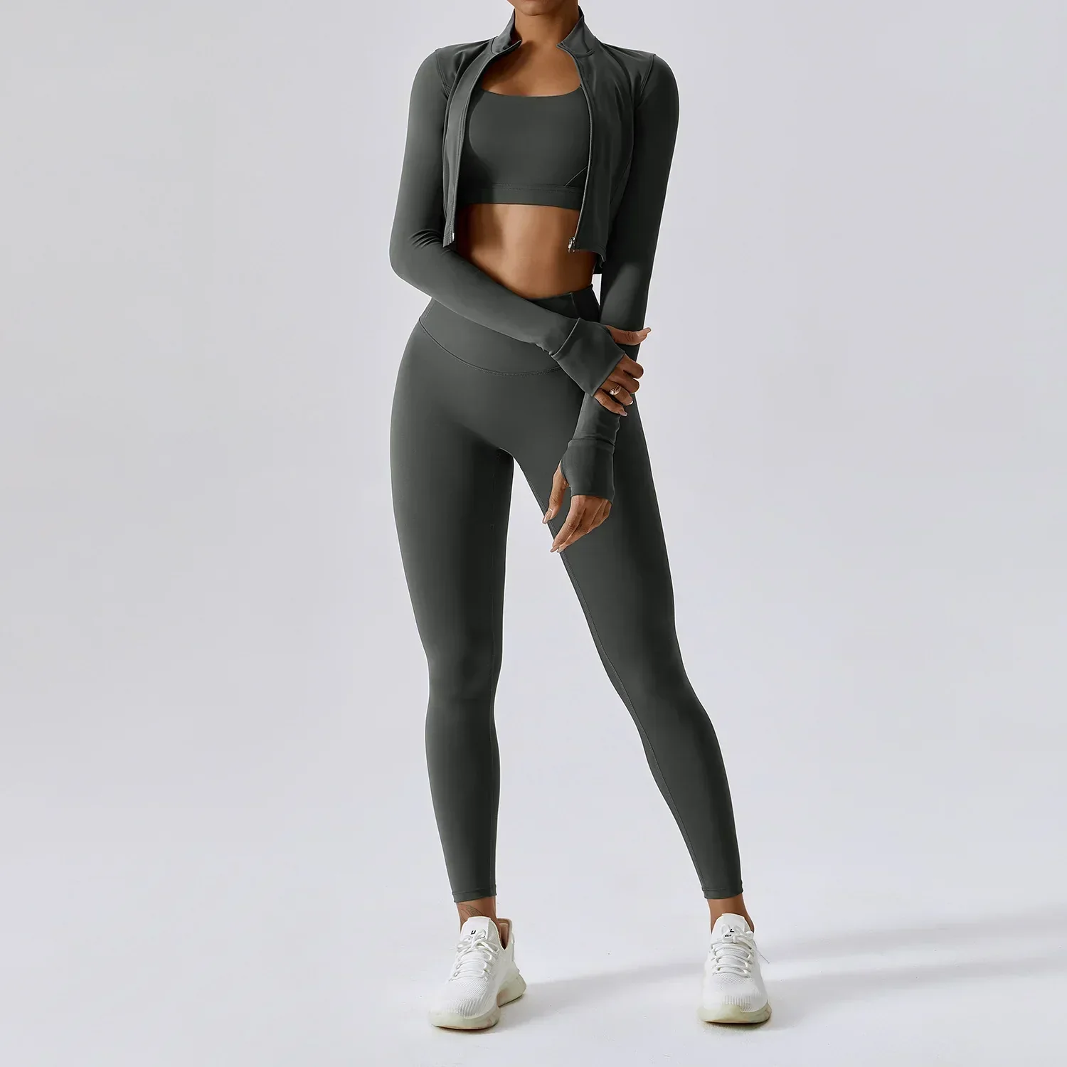 Bestaande uit een ondersteunende sport-bh, een high-waist legging en een cropped sportjack met duimgaten. De hoge tailleband biedt optimale ondersteuning en accentueert je figuur, terwijl de ademende, sneldrogende stretch stof zorgt voor ultiem comfort tijdens elke work-out.