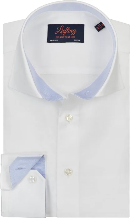 Effen wit fine twill overhemd met subtiele blauwe details van Liefling. Dit luxe witte overhemd is afgewerkt met een blauwe rand in de boord. Het overhemd is uitermate geschikt voor zowel casual als zakelijke gelegenheden. Een twill stof is te herkennen aan de zichtbare diagonale lijnen. Fine twill is nauwer geweven dan andere twill wevingen waardoor er een fijnere stof wordt verkregen. Een cutaway boord is letterlijk een weggesneden kraag en wordt gezien als modern en stijlvol. Met een ’tailored fit’ pasvorm is het shirt licht getailleerd voor een perfecte pasvorm voor elke man.