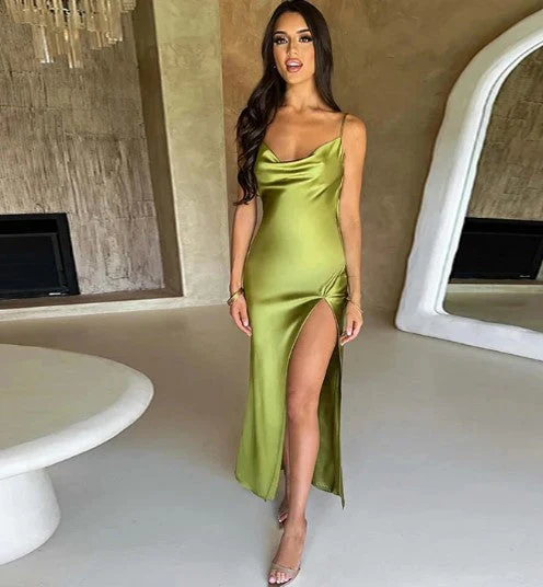 Deze prachtige lange jurk is ontworpen voor vrouwen die willen stralen. Met een luxueuze satijnen look, verfijnde cowl hals en verstelbare spaghetti bandjes combineert deze jurk comfort met stijl. De hoge split voegt een vleugje speelse verfijning toe, ideaal voor een avondje uit, een cocktailfeest of een speciale gelegenheid.