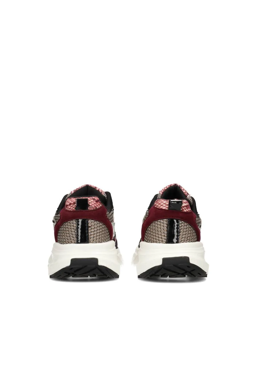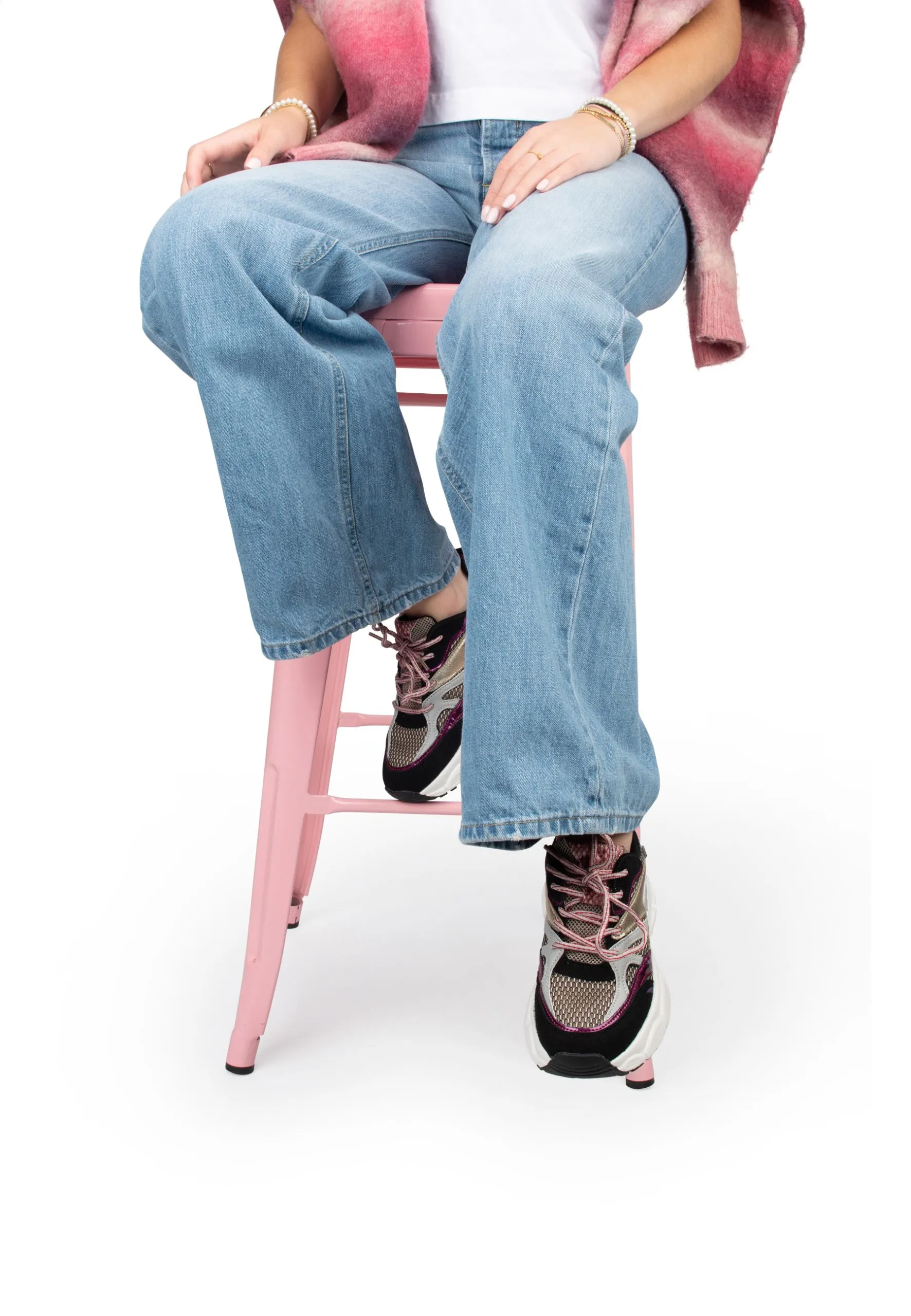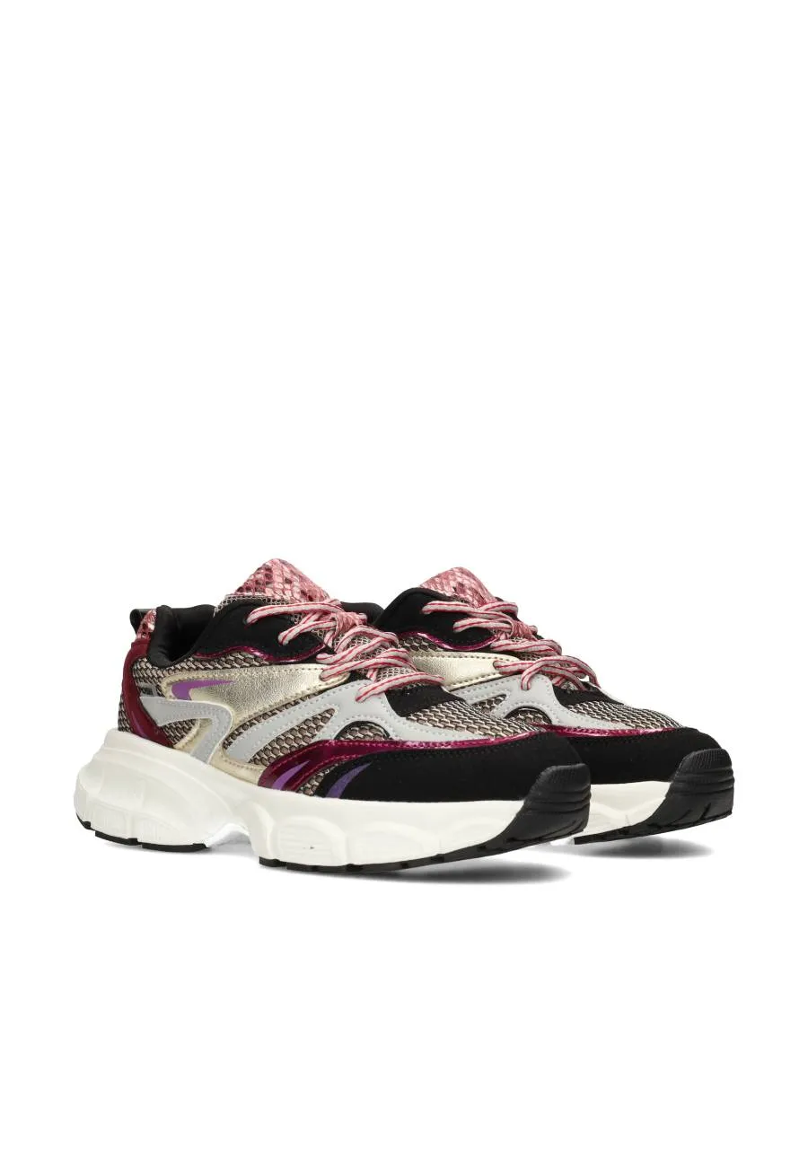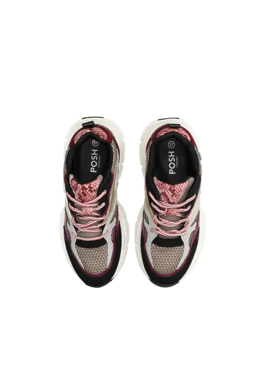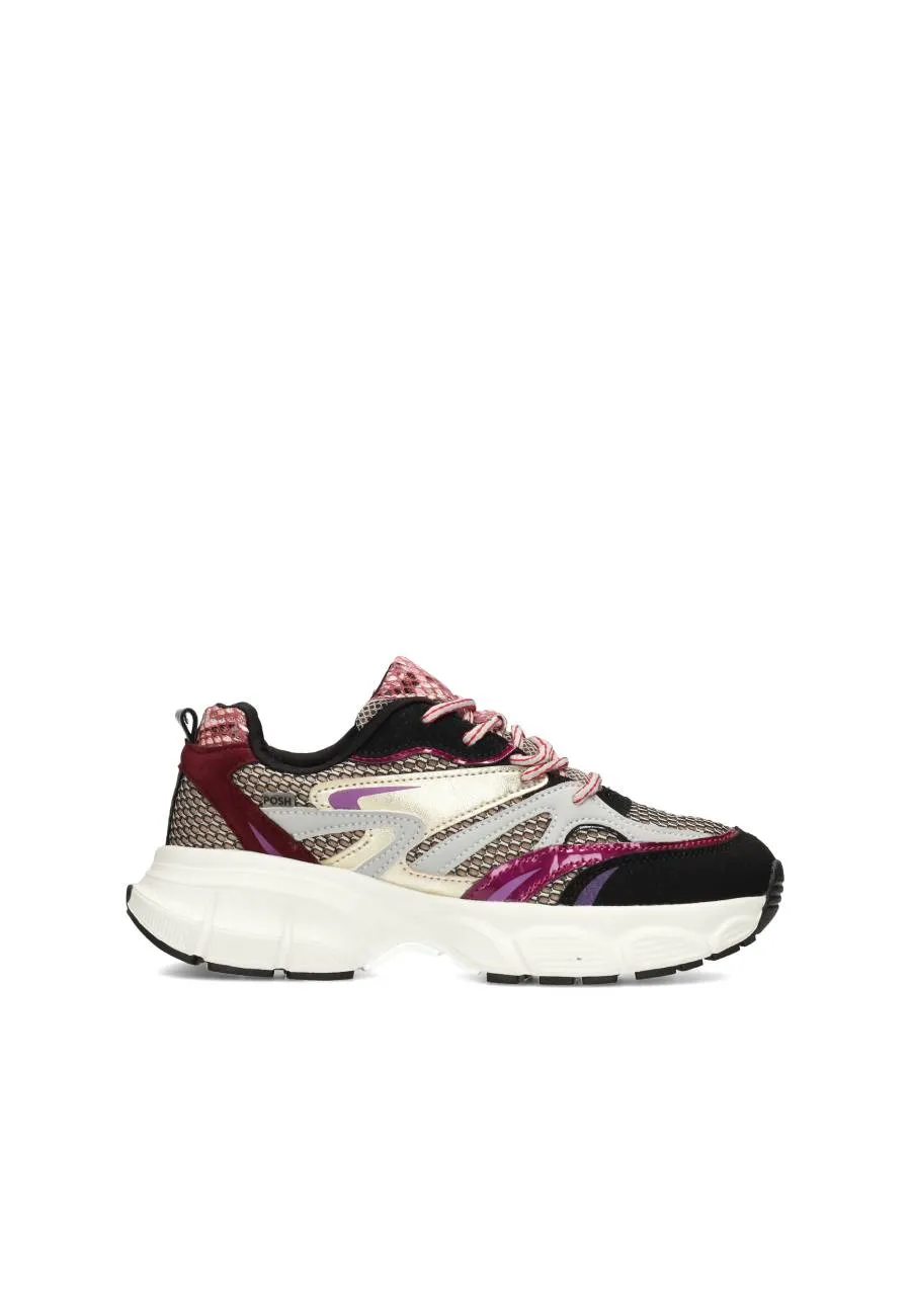 De ALICE dames sneakers van POSH by Poelman zijn een echte eyecatcher. Dankzij de stoere mix van zwart, paars en zilver in imitatieleer, imitatiesuède en ademend mesh, combineer je moeiteloos comfort met een moderne look. De chunky zool van 4,5 cm geeft je nét dat beetje extra hoogte, terwijl je de hele dag geniet van optimaal draagcomfort.