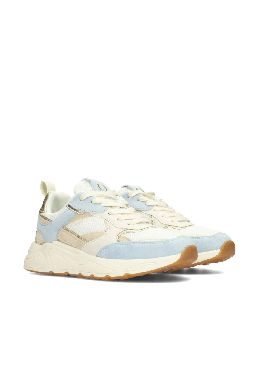 Fris, stijlvol en vol karakter: de CARO sneaker is jouw nieuwe go‑to voor een sportieve citylook. De combinatie van beige mesh met lichtblauwe en gouden accenten geeft de schoen een moderne twist, terwijl de chunky zool van 4,5 cm nét dat beetje extra hoogte biedt. Het uitneembare voetbed zorgt voor comfort, zelfs tijdens lange dagen op pad.