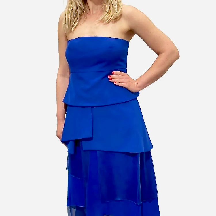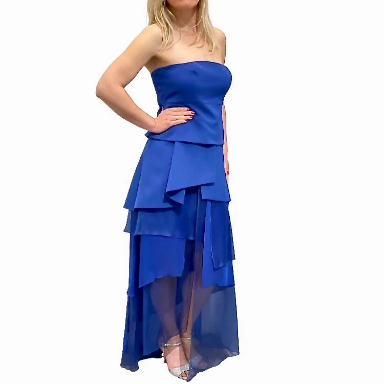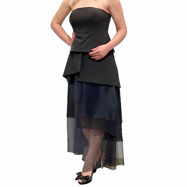 Schouder decolleté halslijn gala jurk van zijde in zwart / kobalt blauw / wit . Deze jurk in het wit kan als bruidsjurk gezien worden. Deze jurk is een mini jurk met een lengte van 73 cm. Zijde flapen van vershillende lengte formen een lange jurk vanaf taille. Transparant zijde zorgt voor een gewichtloos gevoel.