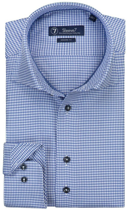 Kobalt blauw Pied-de-Poule overhemd van premium kwaliteit. De stoffen zijn geweven uit 100% Egyptisch katoen van Monti (Tessitura Monti katoen). Deze katoensoort heeft langere vezels waardoor een dichtere stof geweven kan worden, die toch soepel en comfortabel aanvoelt. De stoffen zijn daarnaast dubbel getwijnd (two ply) waardoor het zachter en sterker wordt. De combinatie van Egyptisch katoen én dubbel twijnen zorgt ervoor dat het kobaltblauwe overhemd langer mooi blijft én optimaal draagcomfort biedt. Het Pied-de-poule patroon kenmerkt zich door fijne gebroken vierkantjes, die lijken op hanenpootjes (letterlijk vertaald vanuit het Frans “kippenvoet”). Het overhemd heeft een extra lange mouw. Natuurlijk met Mouwlengte 7.